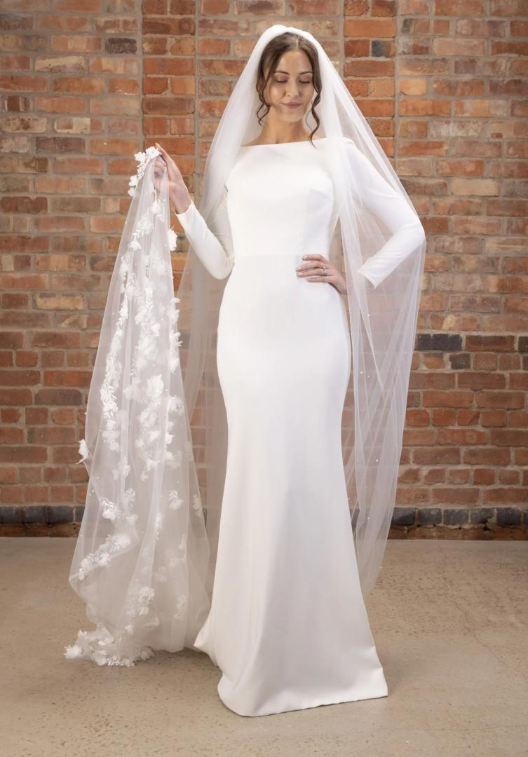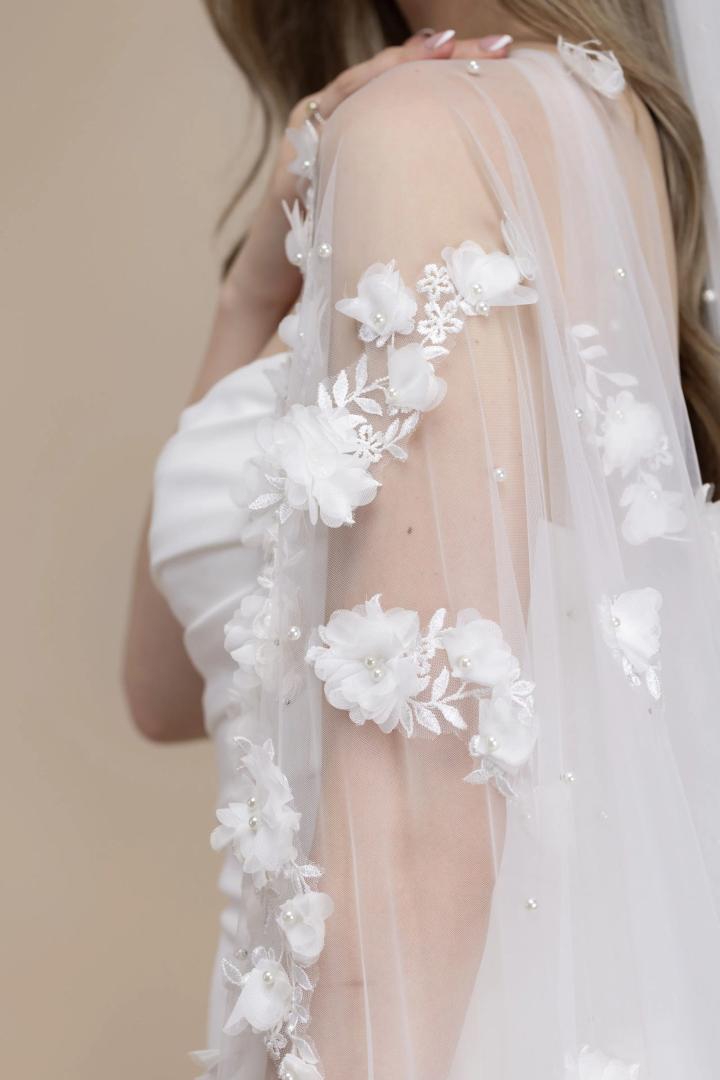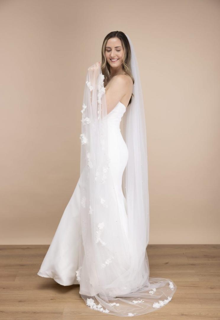 A firm favourite in our veil collection, Intricately adorned with gorgeous 3D flowers and lace on the train, decorated with scattered pearls all over this dreamy cathedral veil will add a touch of ethereal beauty to your bridal attire. Handcrafted from a single layer of the softest ivory tulle this wedding veil effortlessly floats to the ground and feels lovely to touch. Pair with a simpler gown and to let your veil take centre stage! Complete with a metal comb attached to secure into place. 300cm Presented in a luxury Perfect Bridal veil box.