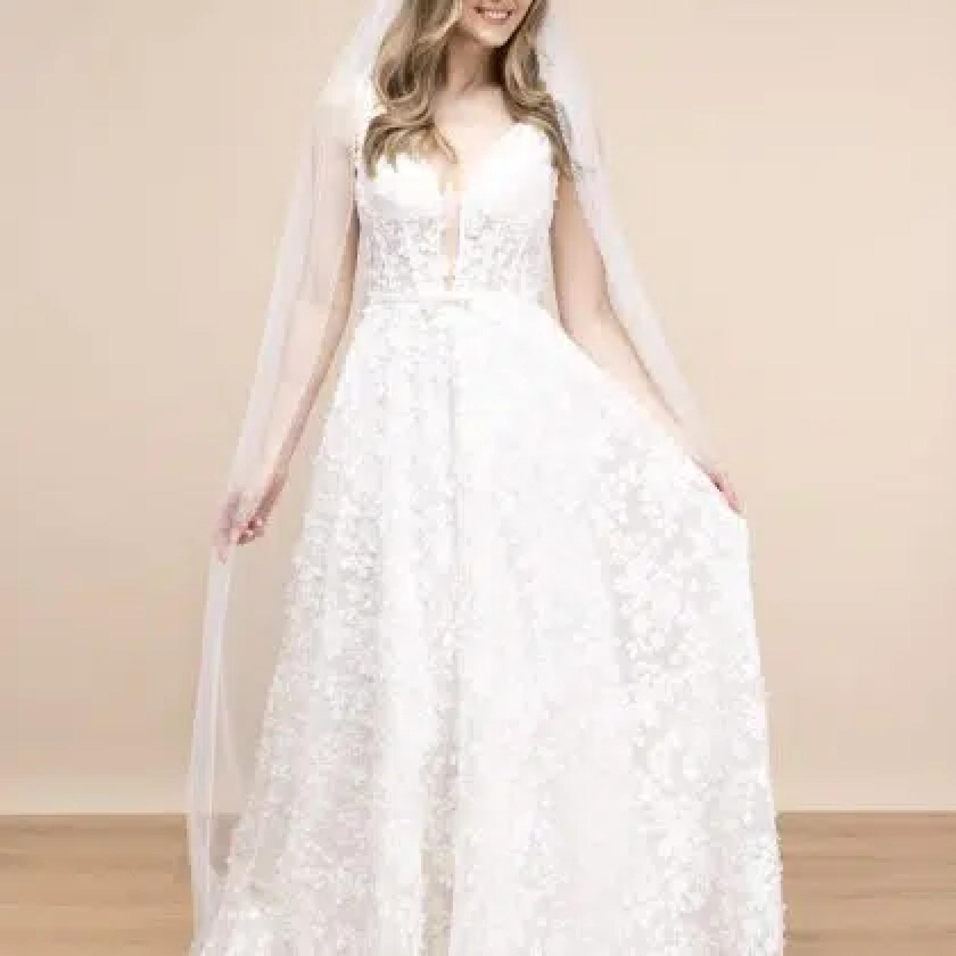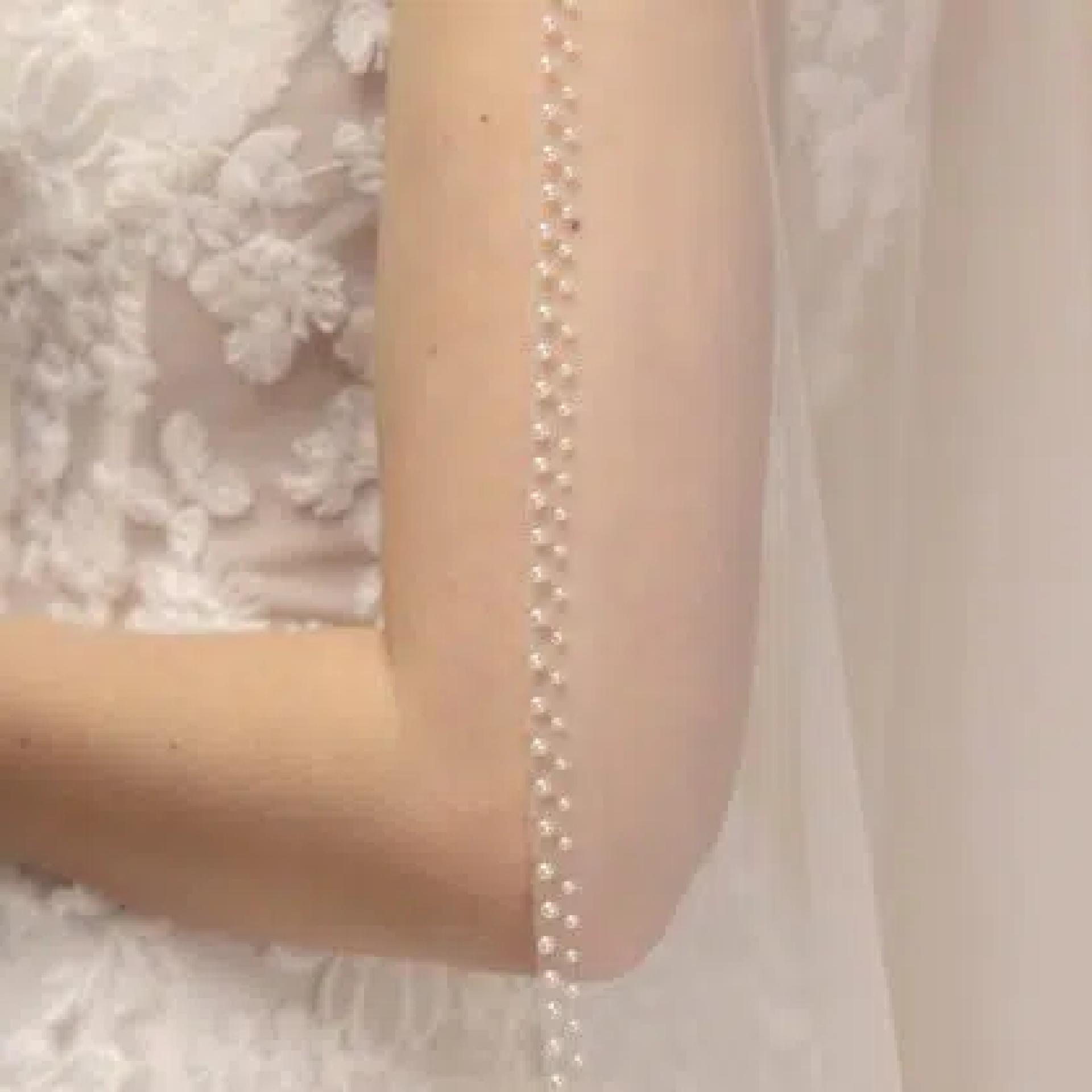 This stunning single tiered, soft ivory tulle design features a delicate double pearl edge.