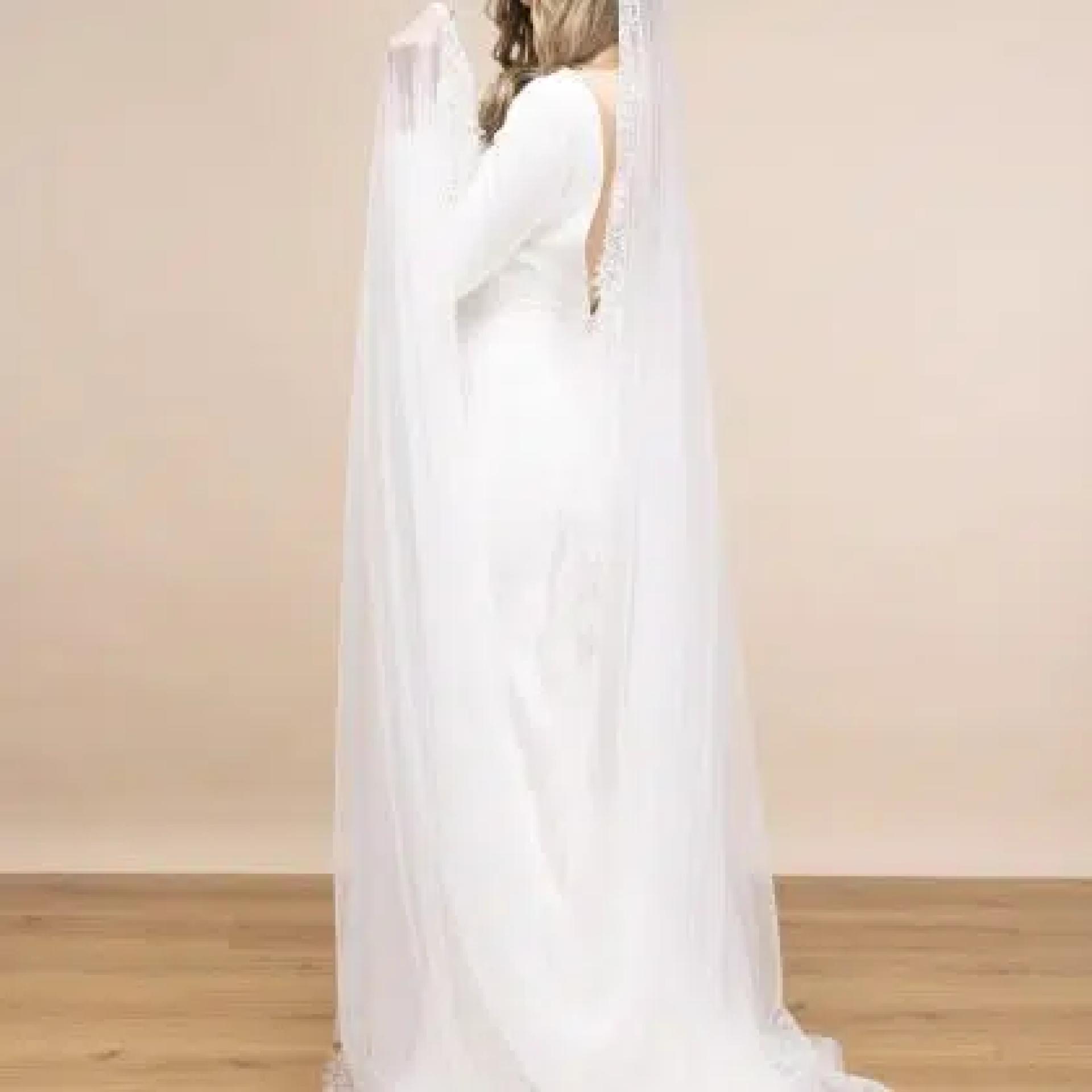 Soft, romantic and beautifully detailed, PBV9088 is crafted from ivory tulle and finished with a wide floral lace trim that runs all the way around the edge. The delicate floral detail adds a soft, romantic feel, while the modern tulle keeps things feeling fresh and contemporary. Floor length and beautifully balanced, it’s the perfect veil for brides who love timeless style with a touch of drama. 300cm All our veils come in our beautiful signature presentation box.